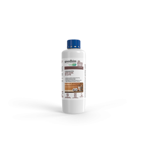 - После отбеливания рекомендуется смыть остатки состава с поверхности древесины полков, теплой водой со щеткой, либо раствором МОЮЩЕГО СРЕДСТВО ДЛЯ БАНЬ И САУН GOODIM S 230 Т 150 (КОНЦЕНТРАТ).
