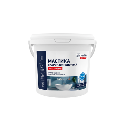 АКРИЛОВАЯ ГИДРОИЗОЛЯЦИОННАЯ ЭЛАСТИЧНАЯ МАСТИКА GOODHIM предназначена для устройства гидроизоляции во влажных и сырых зонах — ванных комнатах, душевых, санузлах.