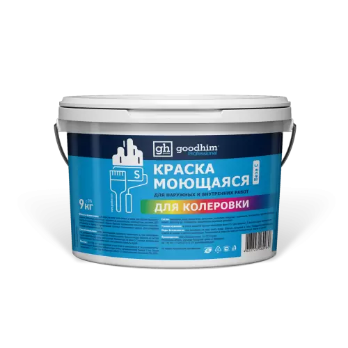 Краска акриловая моющаяся Супербелая goodhim S выпускается в двух базах А-белая и С-для колеровки в насыщенные тона, краска предназначена для окраски всех типов обоев, а также для отделки оштукатуренных, бетонных, кирпичных, деревянных поверхностей, гипсокартона, оргалита, ДСП внутри и снаружи помещений. Образует полуматовое износостойкое покрытие, устойчивое к мытью с применением бытовых моющих средств. Колеровка: пастельные тона.