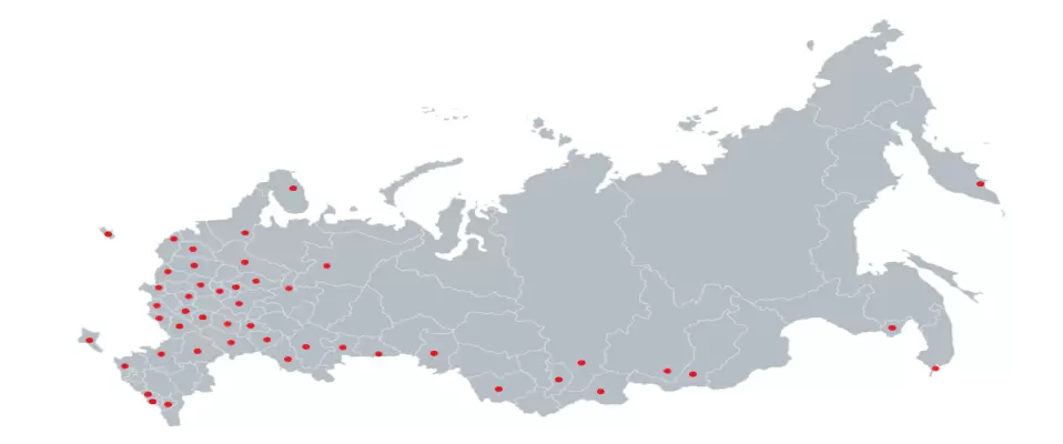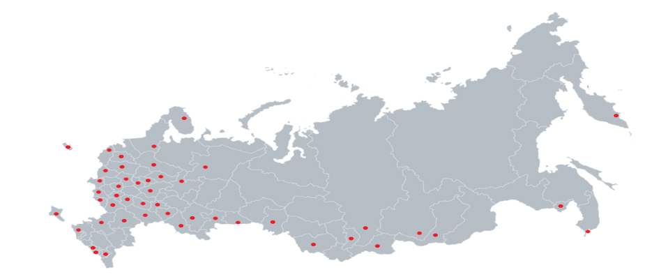 Белгородская область, Брянская область, Бурятия Республика, Владимирская область, Волгоградская область, Вологодская область, Воронежская область, Дагестан Республика, Забайкальский край, Ивановская область, Ингушетия Республика, Иркутская область, Кабардино-Балкарская Республика, Калининградская область, Калмыкия Республика, Калужская область, Камчатский край, Кемеровская область, Кировская область, Коми Республика, Костромская область, Краснодарский край, Красноярский край, Крым Республика, Курганская область, Курская область, Ленинградская область, Липецкая область, Мордовия Республика, Москва , Московская область, Мурманская область, Нижегородская область, Новосибирская область, Оренбургская область, Орловская область, Пензенская область, Пермский край, Приморский край, Псковская область, Ростовская область, Рязанская область, Самарская область, Санкт-Петербург , Саха /Якутия/ Республика, Сахалинская область, Свердловская область, Севастополь , Смоленская область, Ставропольский край, Татарстан Республика, Тверская область, Тульская область, Тыва Республика, Удмуртская Республика, Хабаровский край, Хакасия Республика, Ханты-Мансийский Автономный округ - Югра АО Челябинская область, Чеченская Республика, Чувашская Республика – Чувашия, Ярославская область.