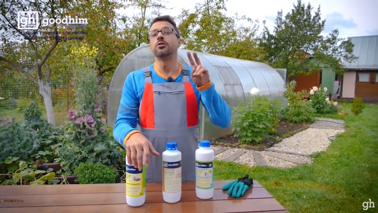 Поэтому рекомендую идти в ногу со временем и пользоваться современными, не менее эффективными и более безопасными химическими средствами. Например, рекомендую моющее средство для теплиц GOODHIM 950 ЭКОУРОЖАЙ. Обратите внимание: состав не содержит хлора, поэтому его спокойно можно использовать и на металлических конструкциях: они не покроются ржавчиной. Поликарбонат тоже не мутнеет, не появляются разводы, он остается первозданно прозрачным, что очень полезно для растений.